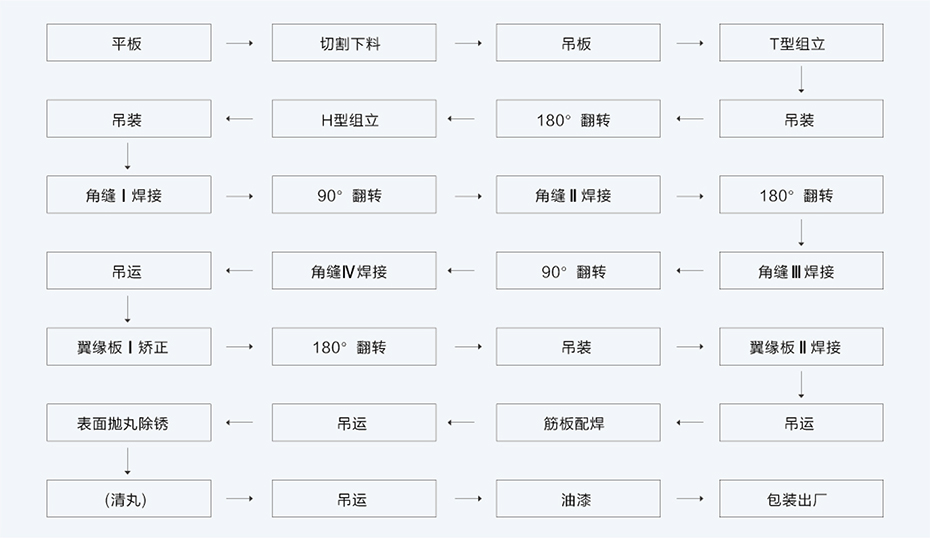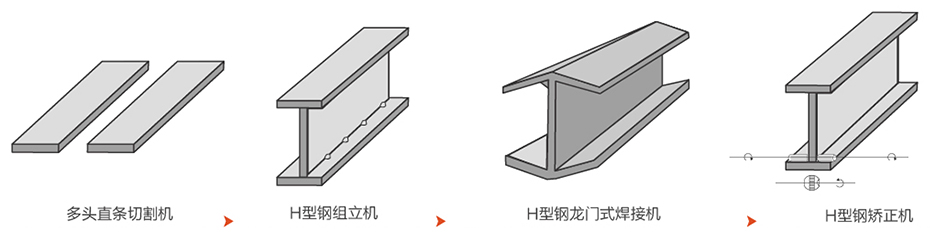 H型鋼生產線組成主要由切割機、組立機、龍門式焊機、翼緣矯正機、拋丸機等主要設備組成,在生產工藝上為單機獨立操作,比較靈活,可在不同的工藝段任意增添設備,以提高整體運行效率。